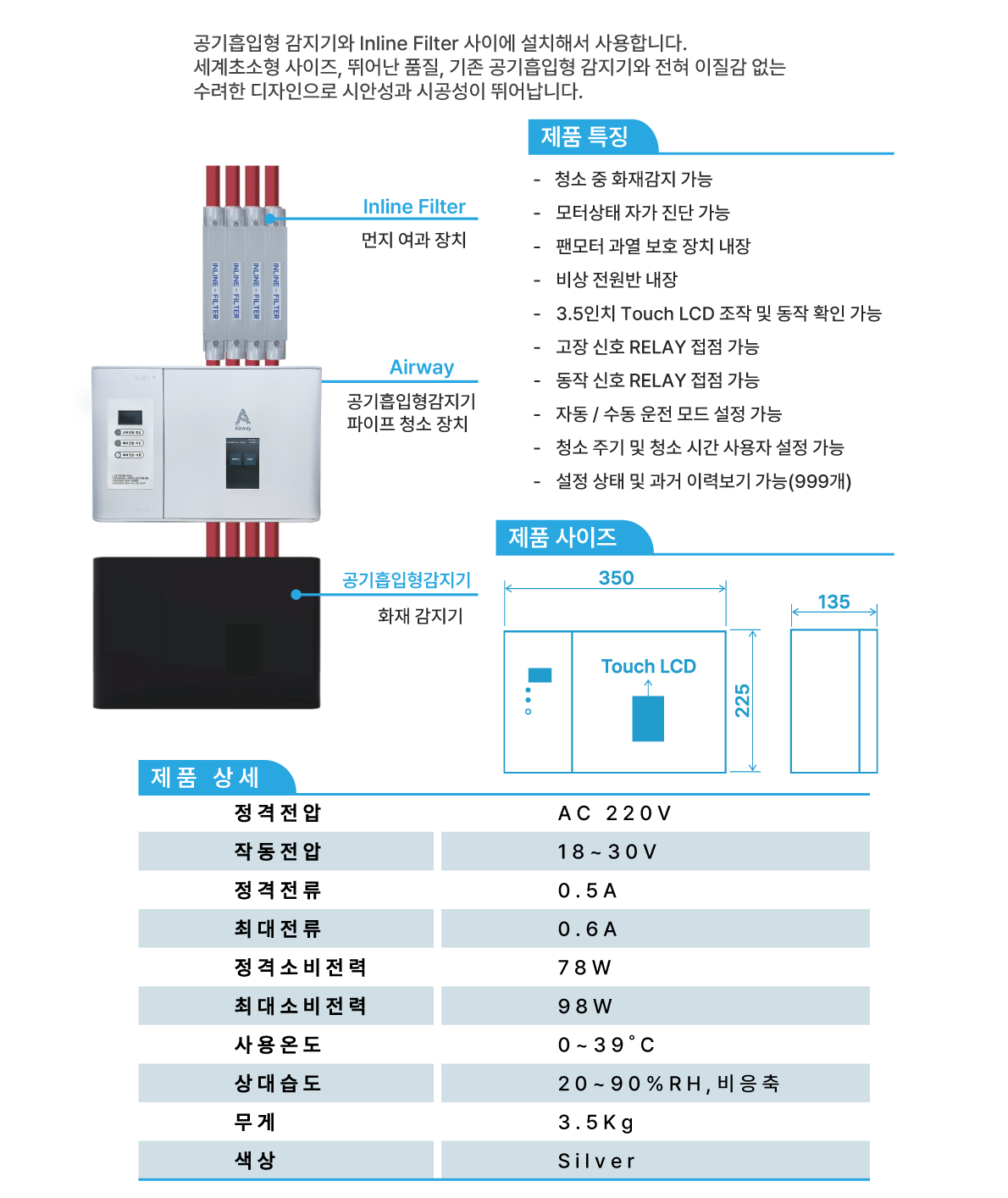 공기흡입형 감지기는 Air Sampling Pipe를 통해 화재를 감지하기 때문에 미세먼지나 온실가스 발생으로 대기 환경 오염이 심각하여 Air Sampling Pipe, Laser Chamber, Filter 등에 먼지가 축적되고 공기흡입형 감지기를 오염시켜 화재 감지 성능이 저하되는 문제가 발생됩니다. 세계 초소형 ACC(Auto Compact Cleaner)를 설치함으로써 Air Sampling Hole 막힘을 방지하여 화재 감지 성능을 유지시킵니다. 또한 주기적인 청소로 Laser Chamber 오염 방지, Filter 수명 연장, Air Flow 장애 발생 감소 등 전체 유지관리 비용을 절감할 수 있습니다.